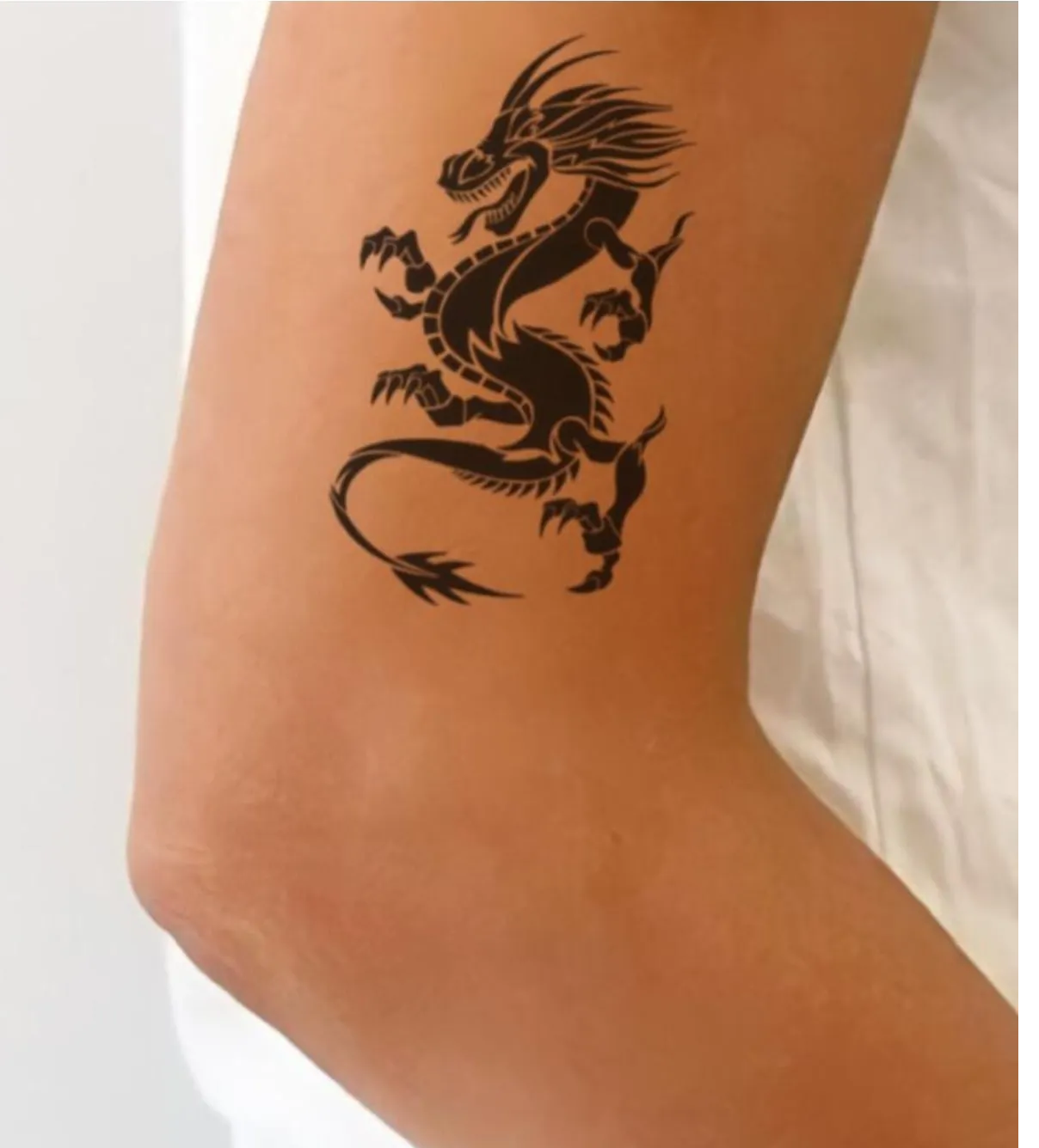 Ejderha deseni, etkileyici görünümüyle hem günlük kullanımda hem de özel günlerde dikkat çekici bir aksesuar olarak stilinize farklı bir hava katacaktır. Geçici dövme modelleri arasında güçlü ve görkemli bir seçenek olan bu dövme, benzersiz bir stil yaratmak isteyenlerin vazgeçilmez tercihi olacaktır.