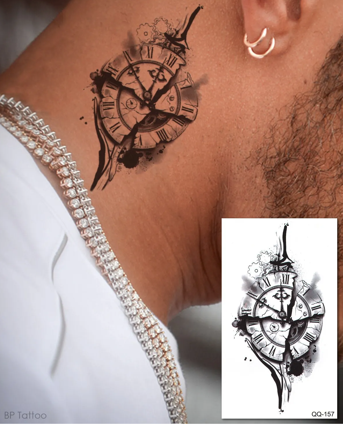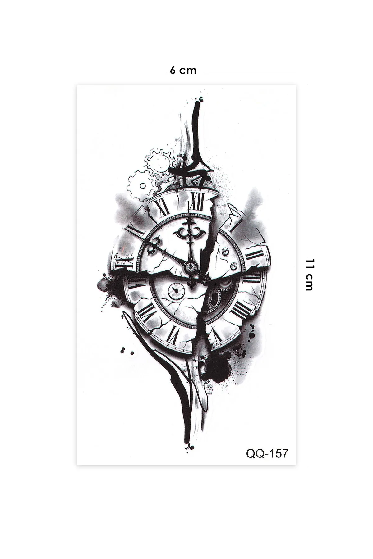 Suya dayanıklı ve uzun süre kalıcı olan bu geçici dövme, zahmetsizce uygulanır ve çıkarılır. Geçici dövme modelleri arasında öne çıkan bu tasarım, hem günlük kullanımda hem de özel etkinliklerde harika bir aksesuardır. Kırık saat dövmesi ile stilinize mistik ve etkileyici bir hava katın. Her türlü kıyafetle uyum sağlar ve dikkatleri üzerinize çeker. Şık ve derin anlamlı bir geçici tattoo seçeneği arıyorsanız, bu tasarım mükemmel bir tercih olacaktır.