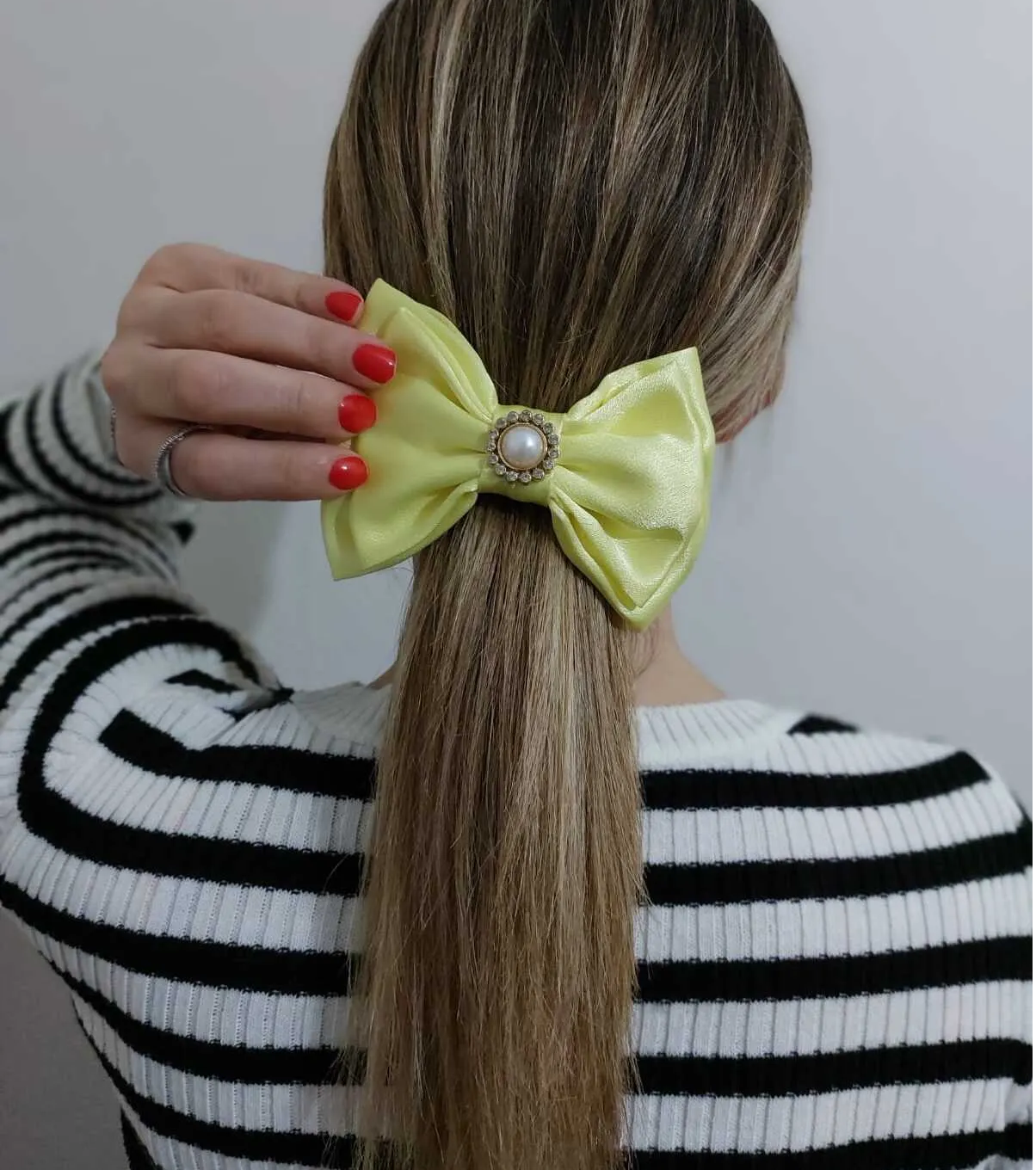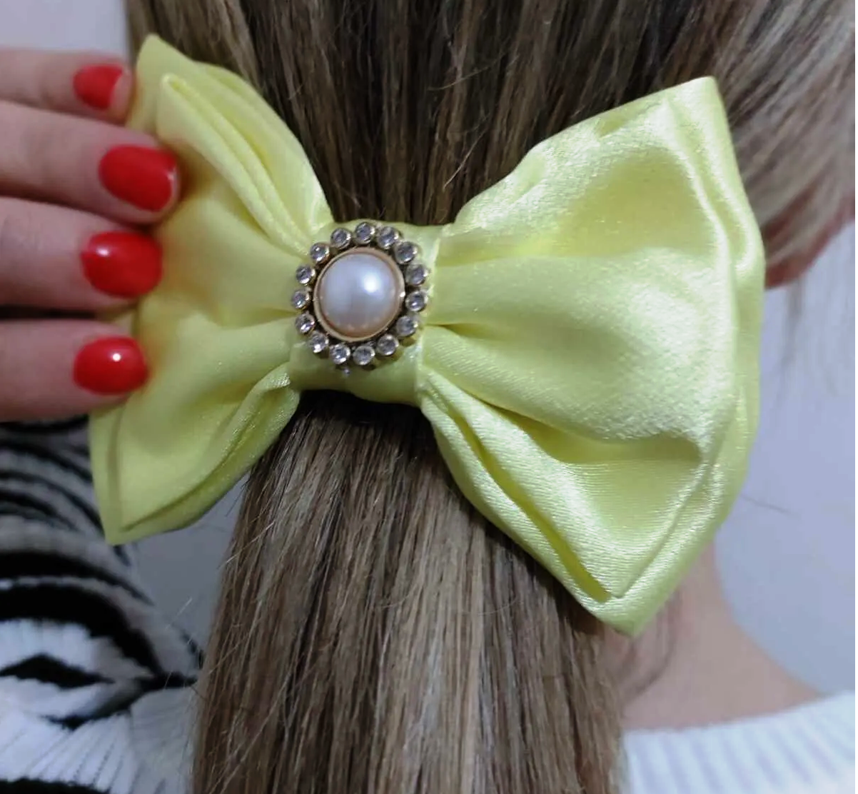 Limon sarısı rengindeki bu orta boy fiyonk toka, şık ve gösterişli bir aksesuar arayanlar