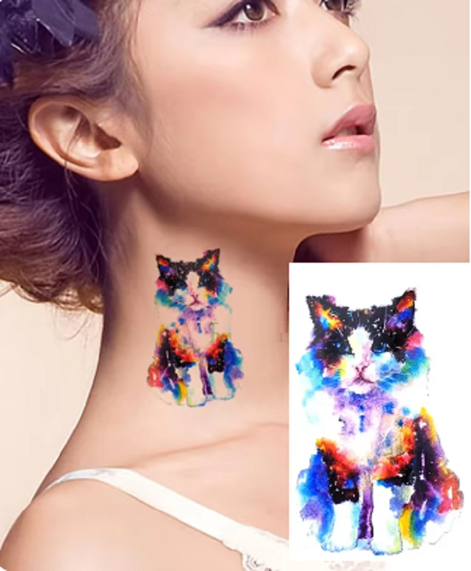 Geçici dövme modelleri arasında öne çıkan bu renkli kedi tasarımı, hem günlük kullanım hem de özel etkinlikler için mükemmel bir aksesuardır. Tarzınıza eğlenceli bir hava katacak bu dövme, tüm dikkatleri üzerinize çekmek için harika bir seçenektir. Renkli ve canlı görünümüyle her türlü kıyafetle uyum sağlar.