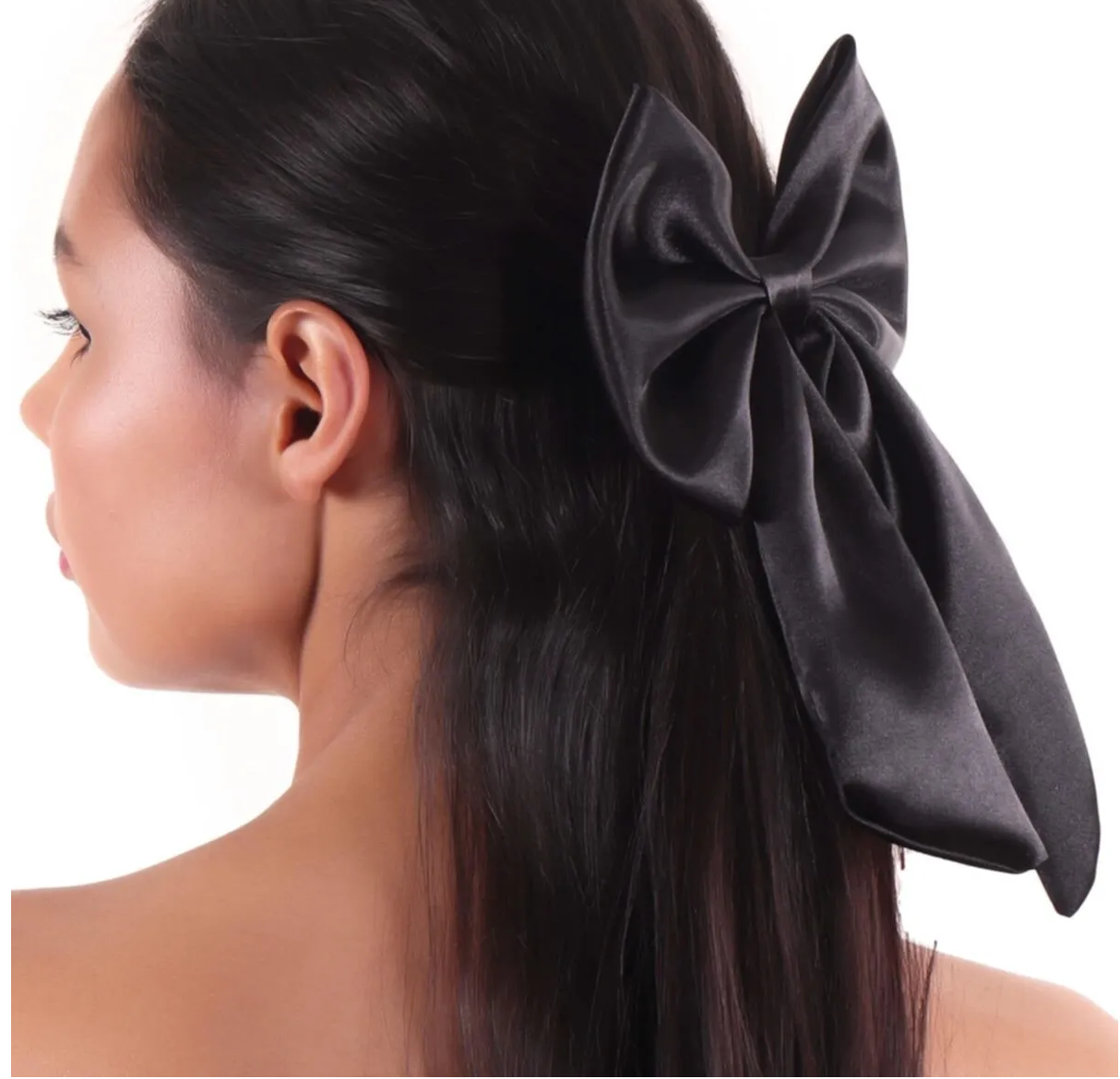 Bu özel siyah saten fiyonk toka, saçınıza şık bir