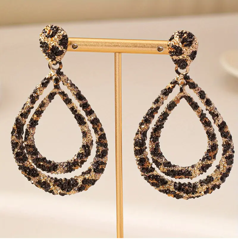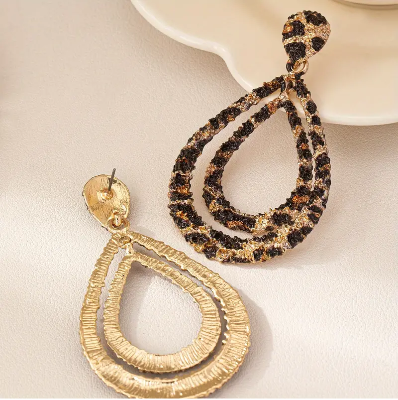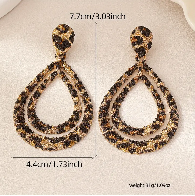 Vintage Tarz Çelik Çift Katmanlı Leopar Desenli Büyük Küpe